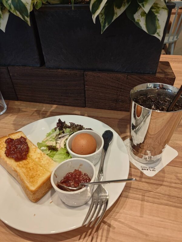 研修の前に立ち寄った喫茶店で、トーストとゆで卵、香ばしいコーヒーをゆっくり味わいました。