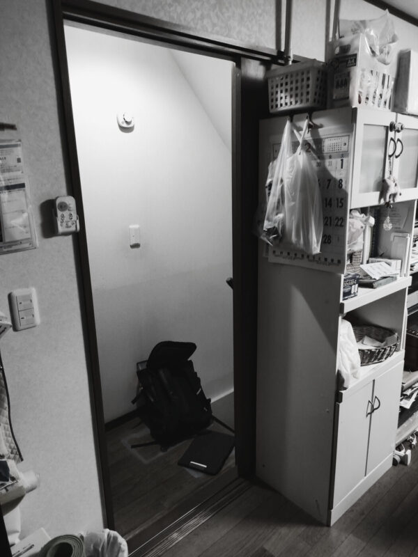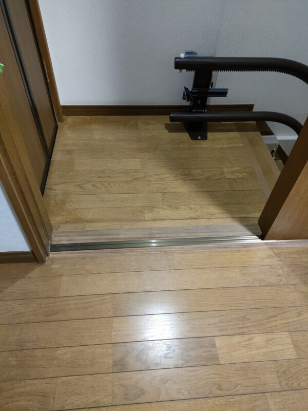 ご自宅での生活では、トイレ前に踊り場を挟んですぐ階段があるため転落の危険がありました。さらに、トイレへ行くまでには出入口を含め2カ所の段差があり、またぎ動作が難しいご本人にとって大きな負担となっていました。加えて外開きドアは前方の障害物に当たり、扉が開ききらず、出入りや介助の妨げとなっていました。
