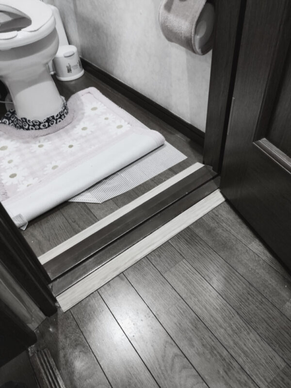 そこで、トイレの扉を外開きドアから折れ戸へ変更し、開閉スペースを小さくして動作をしやすくしました。また、2カ所の段差を撤去して床をフラットに仕上げることで、またぎ段差がなくなり、ご本人の移動と移動介助がスムーズになりました。